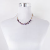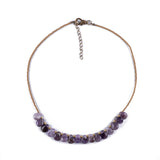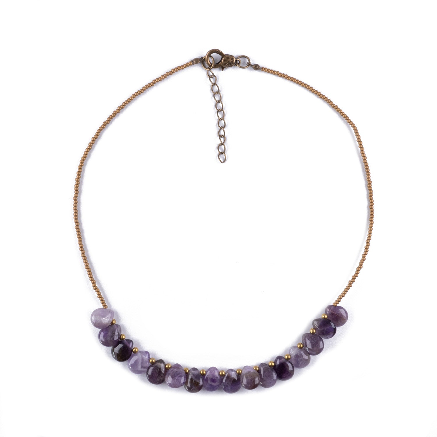El collar combina amatistas pulidas de forma irregular con pequeñas cuentas tipo semilla, creando una pieza simple pero con carácter. Hecho a mano con amor y cuidado en cada detalle.